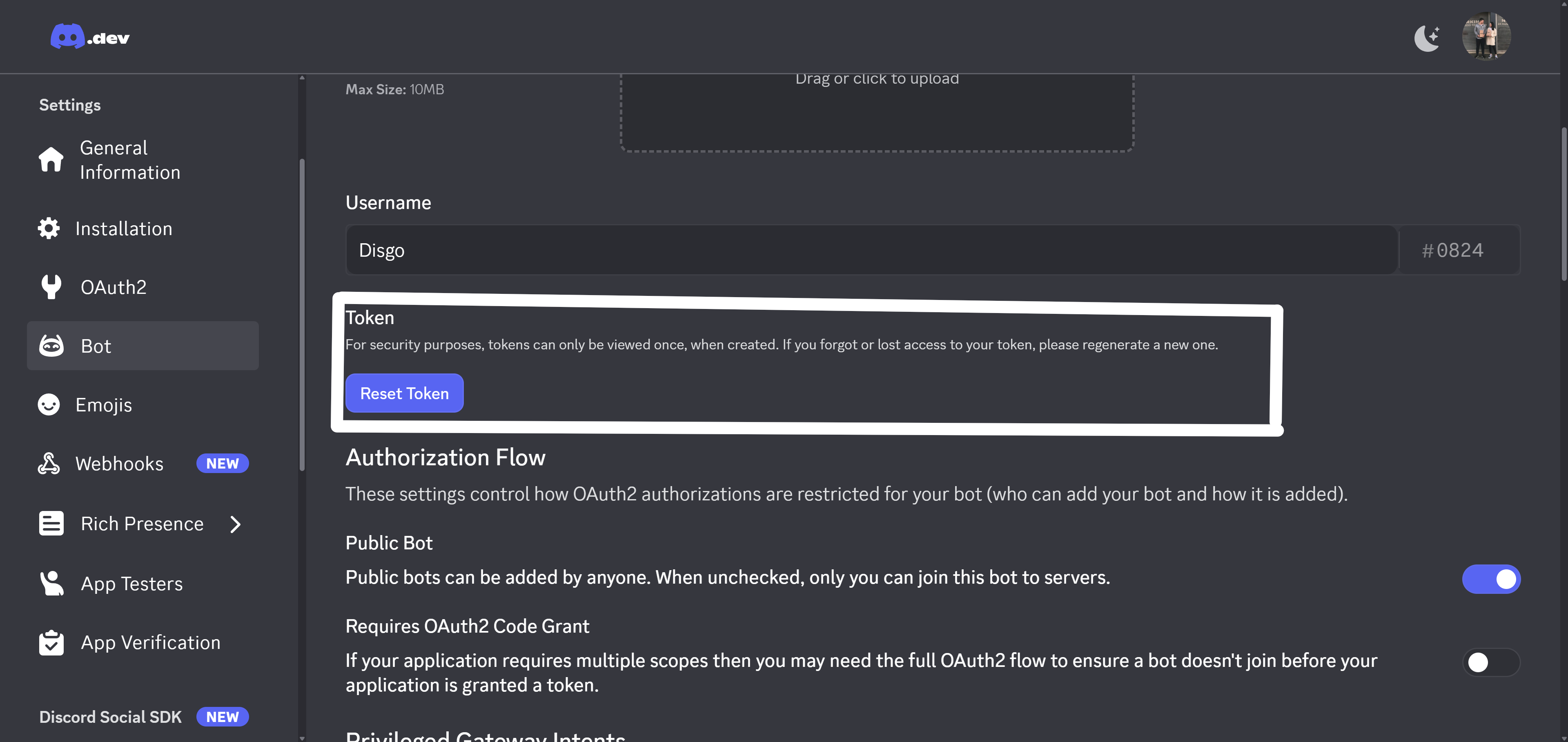 If you think your bot token has been leaked (i.e. a compromised token), immediately go to this page and reset it again